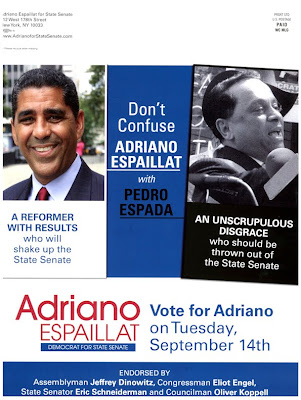 Looks like Adriano Espaillat’s campaign thinks he has an Espada problem – that is that voters may confuse the assemblyman who is running to fill the 31st District Senate seat of attorney general hopeful Eric Schneiderman with Pedro Espada, the incumbent state senator in the neighboring 33rd District. They’re both Latino of course and share the first four letters for their last name, but Espaillat apparently wants to make sure that voters know the similarities end there. This flier was distributed in at least one building in Riverdale this morning.