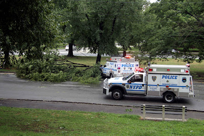 For the first time in more than 30 years, a tornado hit the Bronx on Sunday afternoon, according to the National Weather Service. The Riverdale Press reports that the eye of the storm centered around north Riverdale, but effects were felt throughout the north Bronx, including Williamsbridge Oval Park (pictured above) and Mosholu Parkway (pictured below), where police used a truck to push a tree off the road. If you know of any other downed trees causing problems in your neighborhood, send in photos and we’ll follow up with city agencies.