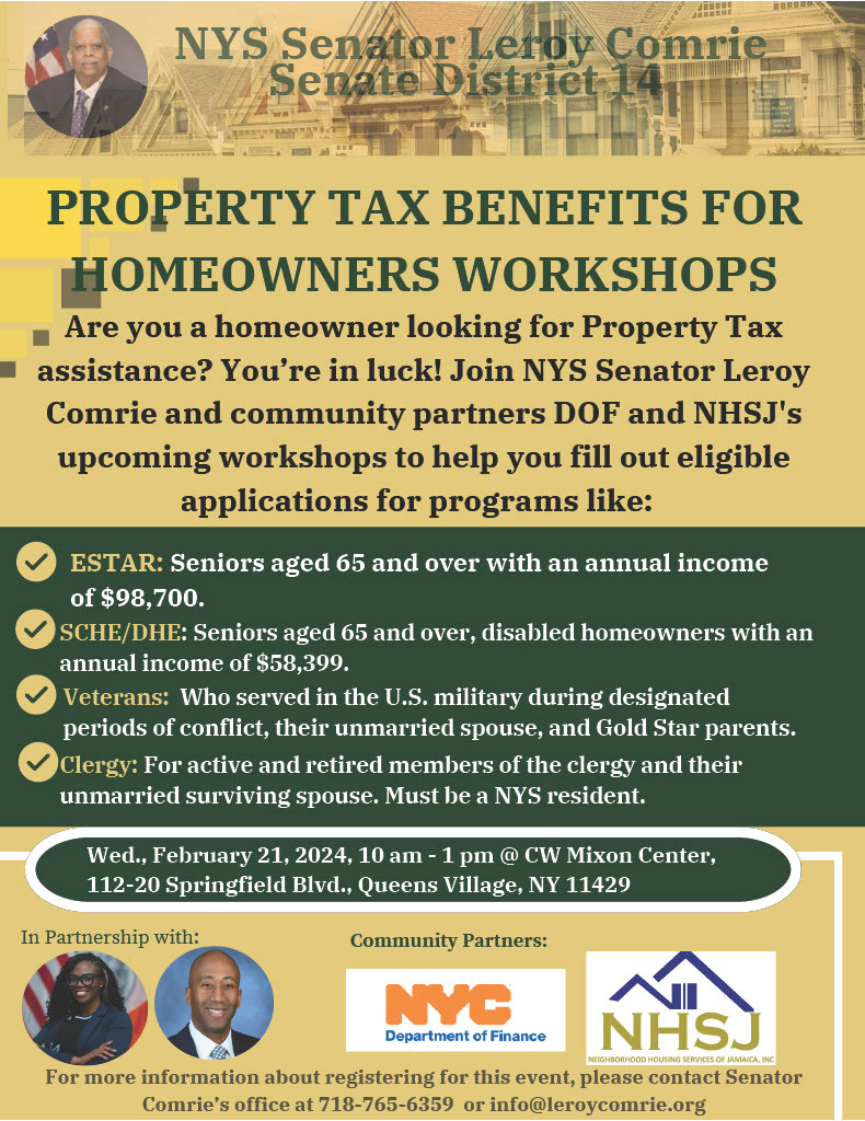 - Wednesday, 2/21 at 10 a.m.: The offices of City Councilmember Nantasha Williams, State Sen. Leroy Comrie and Assemblymember Clyde Vanel will host a workshop about property tax benefits for homeowners in Queens. More here.